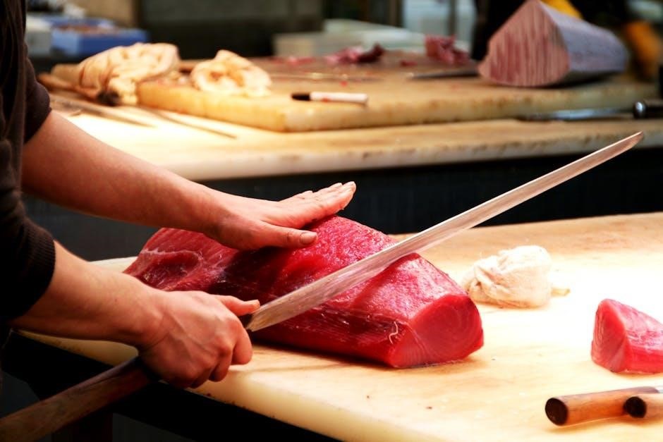 Thin slicing is a refined technique that transforms tough cuts into tender, almost velvety pieces, making it ideal for delicate dishes like Japanese gyudon or Italian carpaccio; By freezing the meat slightly, it becomes firmer, allowing for precise, even cuts․ A sharp knife is essential to prevent tearing, ensuring uniform slices that absorb flavors beautifully․ This method is perfect for raw or lightly cooked dishes, where texture and presentation are key․Thin slicing enhances the culinary experience, making even tougher cuts suitable for sophisticated dishes, ensuring a refined and memorable dining experience․