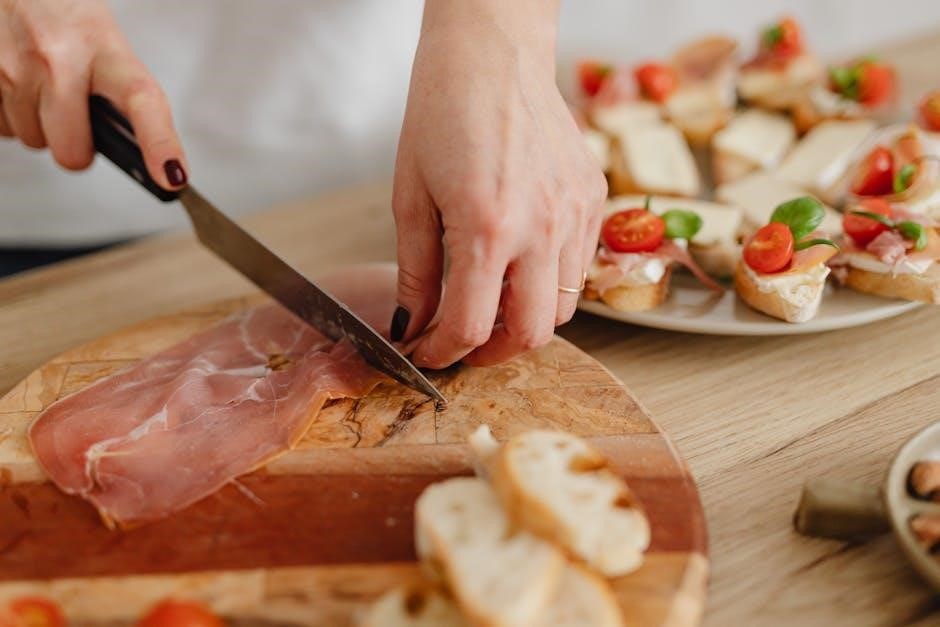 Selecting the right knife is crucial for precise meat slicing․ A sharp, high-quality chef’s knife or slicer knife is ideal, as they ensure clean cuts and prevent tearing․ For thinner slices, a razor-sharp blade is essential, while serrated knives work well for fatty or fibrous meats․ Maintaining knife sharpness is key, as dull blades can smear fats and make slicing uneven․ Regular honing and proper storage will extend the life of your knife, ensuring consistent results․ The right knife, paired with proper technique, elevates the quality of your sliced meats, making every dish more flavorful and visually appealing․